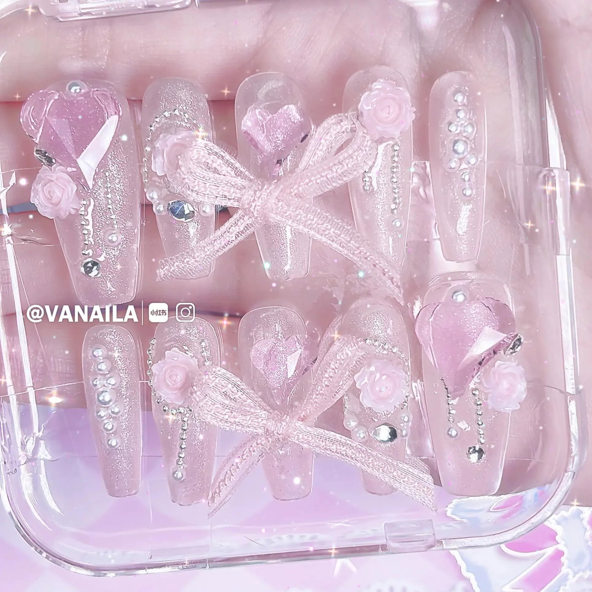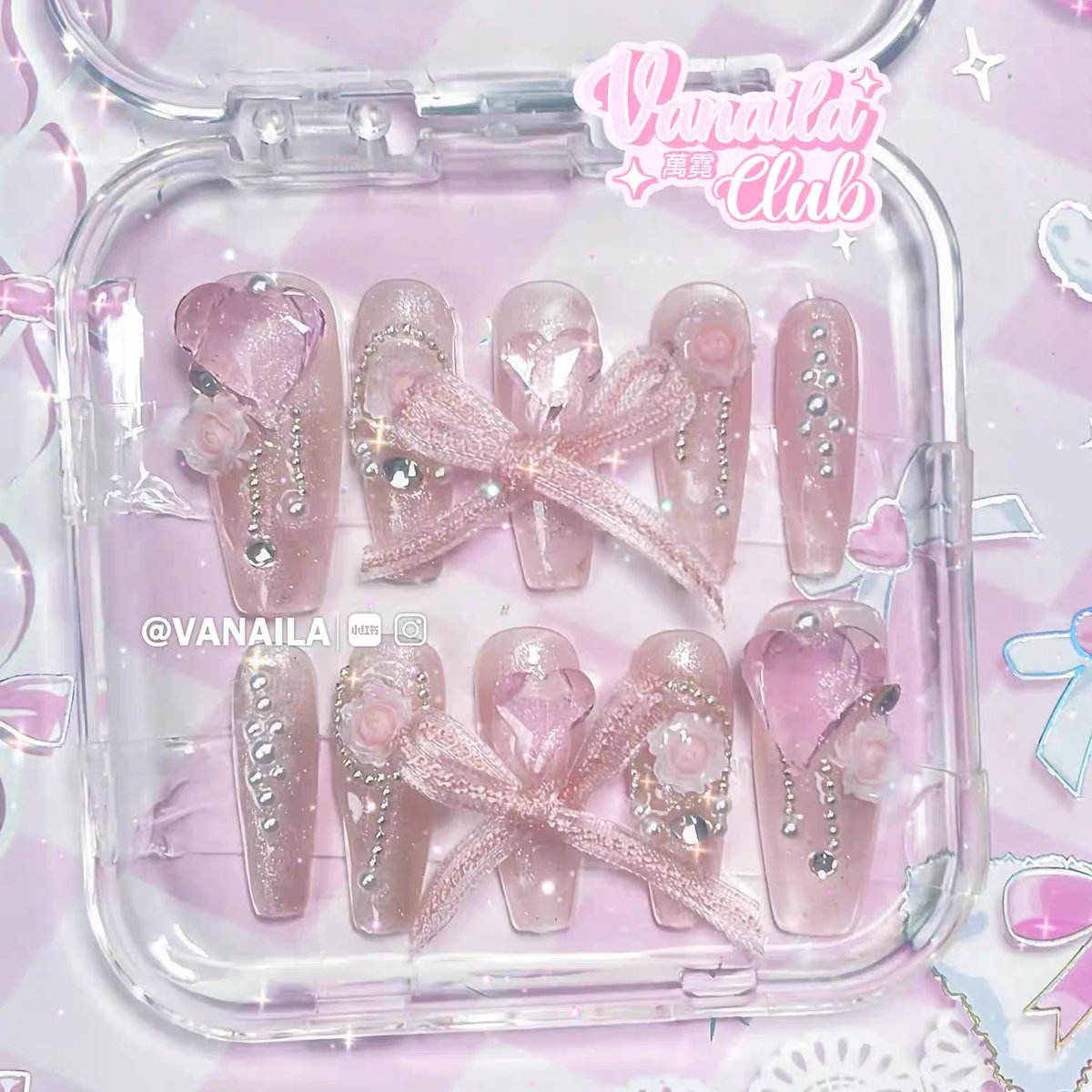 Uñas press on corazón y lazo gigante